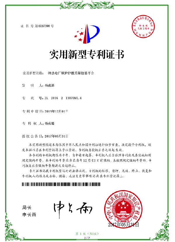 部件采用模块化设计成满膛结构,淘汰回型结构镂空的空缺(工作走台满膛平铺无盲区);去掉折叠平台走台上的斜拉索,设计成下撑杆式的折叠走台,极大地方便了工作走台上的人员无障碍行走。循环流化床锅炉可以直接在炉底风帽上组装完成,煤粉锅炉可以在运转层检修人孔以下0.5米左右的标高位置安装(可配套设置冷灰斗专用的我公司专利产品:煤粉锅炉灰口支撑平台),把检修升降平台由运转层平台人孔门运进炉内,直接在搭设好的灰口支撑平台上组装。
